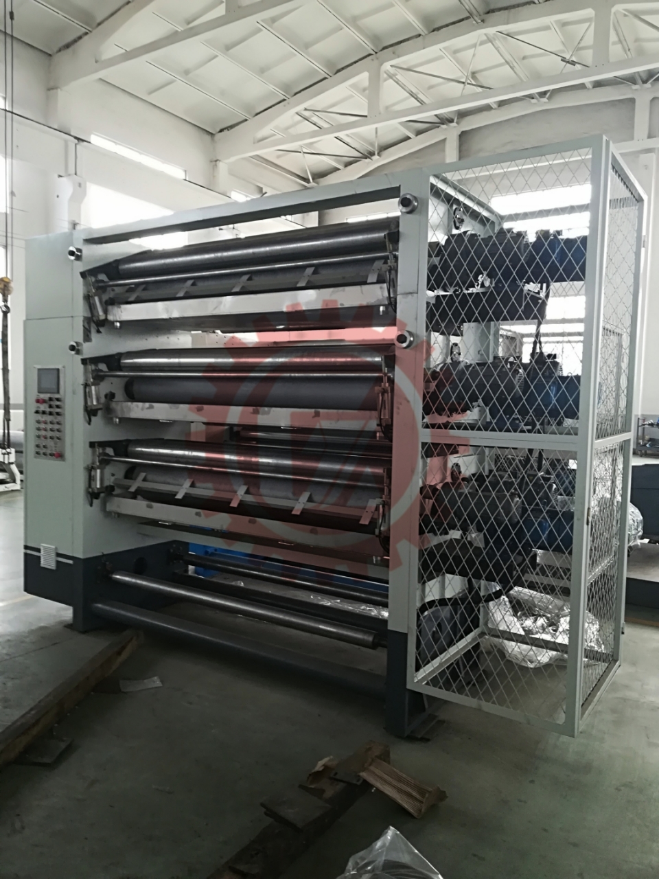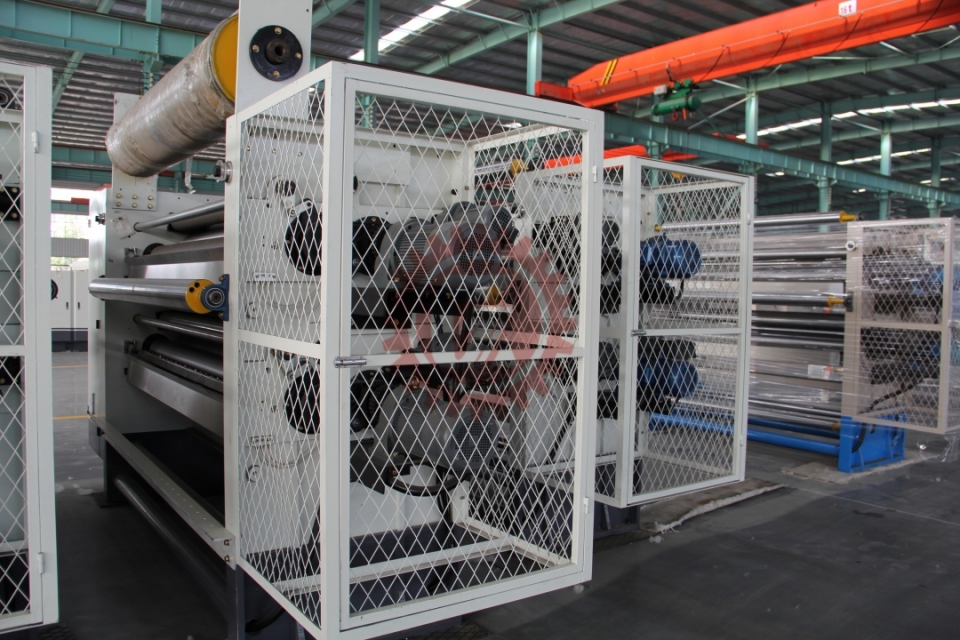 GM-35 two-layer gluing machineTechnical parameters: Working breadth:2500mm Design speed:350m/min Economic speed:180--280m/min Adjustment range of adhesive amount:0.08-0.6mm Glue roller mesh number:40 lines Preheating cylinder temperature range:150—200℃ Working power supply:380V 50Hz 15KW Air source system:0.4—0.9Mpa Compression method:Pneumatic Main performance characteristics: The second layer gluing machine is used to transport corrugated paper from the overpass, preheat and heat it up, apply glue again, and then enter the double-sided machine for gelatinization and bonding, producing three layers and five layers of cardboard. Cast iron frame structure, stable performance, upper and middle preheater with a diameter of 400mm, increasing paper temperature for easy glue gelatinization, double pressure roller design for uniform glue coating, stainless steel glue groove, automatic circulation glue supply. After the surface of the glue roller is quenched an…