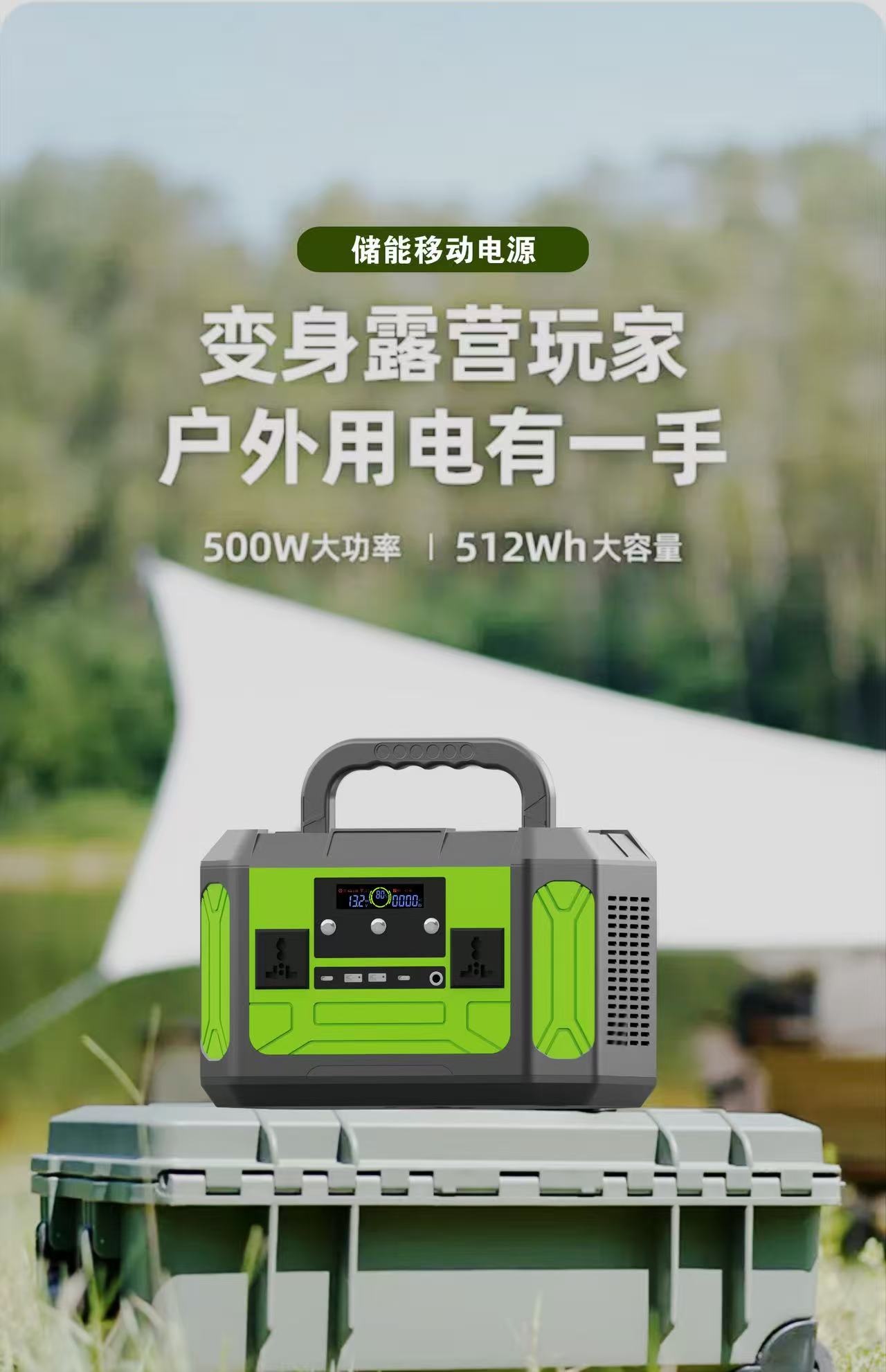 Energy storage power source factory, using lithium iron phosphate battery core, capacity 512 WH,The product features LED lighting, 110/220V AC output, Tybe-c, USB, DC charging port, and solar charging.Basically, it can meet all your power supply needs. Our products include:Portable Power Station,Portable Generator With AC Outlet,Power Bank With AC Outlet...