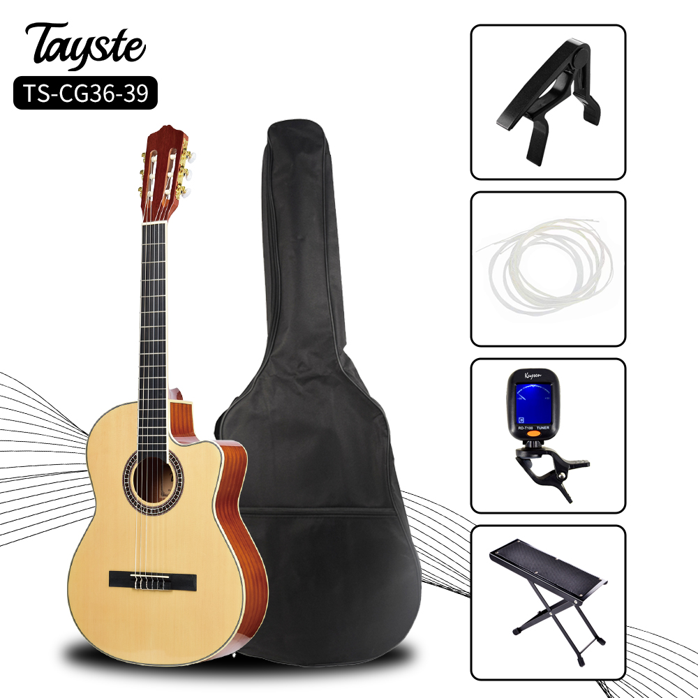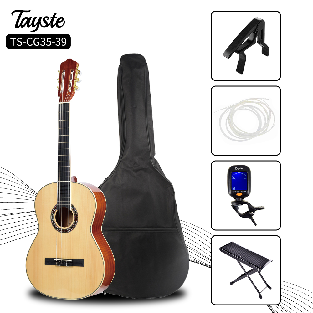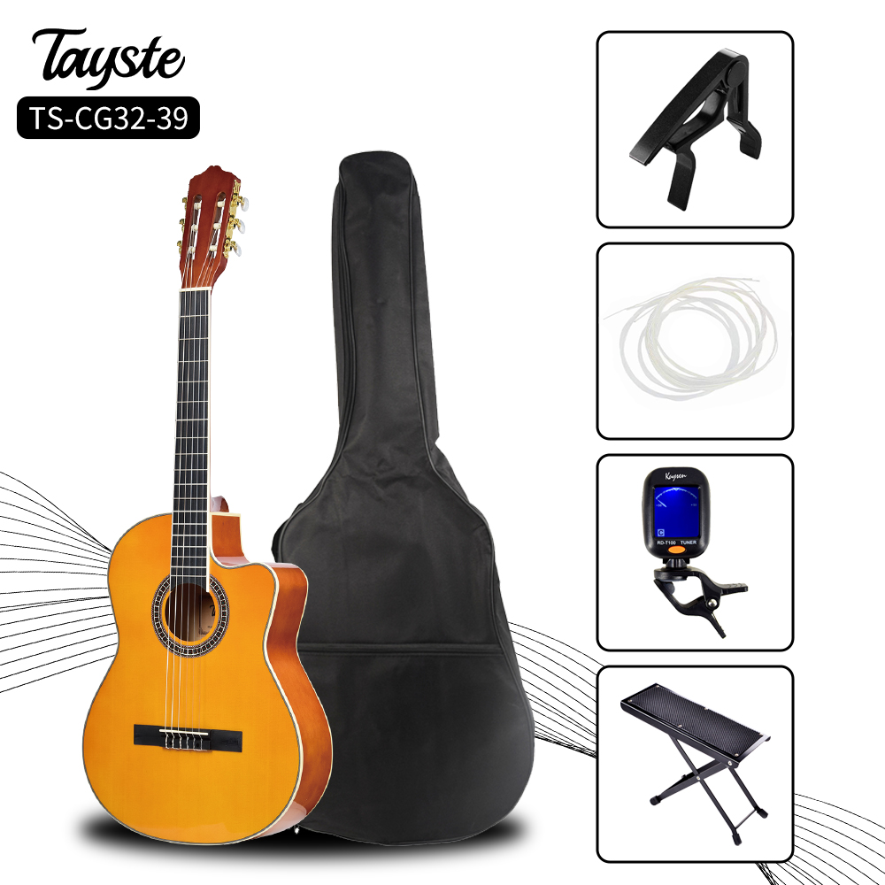Tayste Nylon 6-string beginner classical guitar established in 2010. Ours stock size is 3/4 and 4/4(36/39inch). One of our top priorities is to provide availability and convenience for our customers, so we offer a convenient online catalog on our website where you can view our product range and place orders at any convenient time! Complete guitar set for beginner:include guitar capo,bag,digital tuner,footbtool,allen wrench and guitar nylon string set. We accept sell single guitar or guitar kit which cilents choose the guitar accessories prefer. Stocks:Tayste brand also accept customized you own brand logo. Package:6Pcs/Carton The one-stop-shop for all your musical requirements.We specialize in maintenance stringed musical instrument and accessories,it is easy purchase guitar bag/case,speaker,strap,capo,string set,etc. After sales service-Last, but not least, you can rest; reassured that we have a team of professional and dedicated craftsmen and technicians that can assuredly cater…